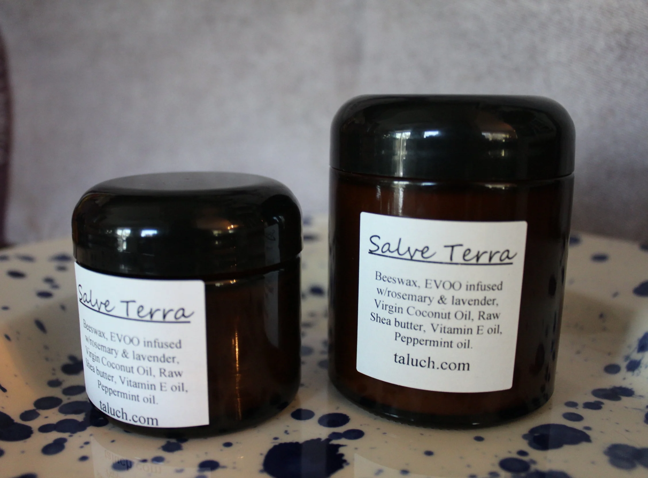 Salve Terra (sahl'veh tehr'rah) grew out of the need for a hand and body salve for working hands and dry skin. Created while Alexandra Talucci was working in Turin, Italy, this hand salve soon became a staple of everyday use for her. Simple and natural ingredients that hydrate and brighten your skin. Salve is also an Italian word for Hello, and Terra is Italian for Earth, with this play on words and language it translates to "Hello Earth".