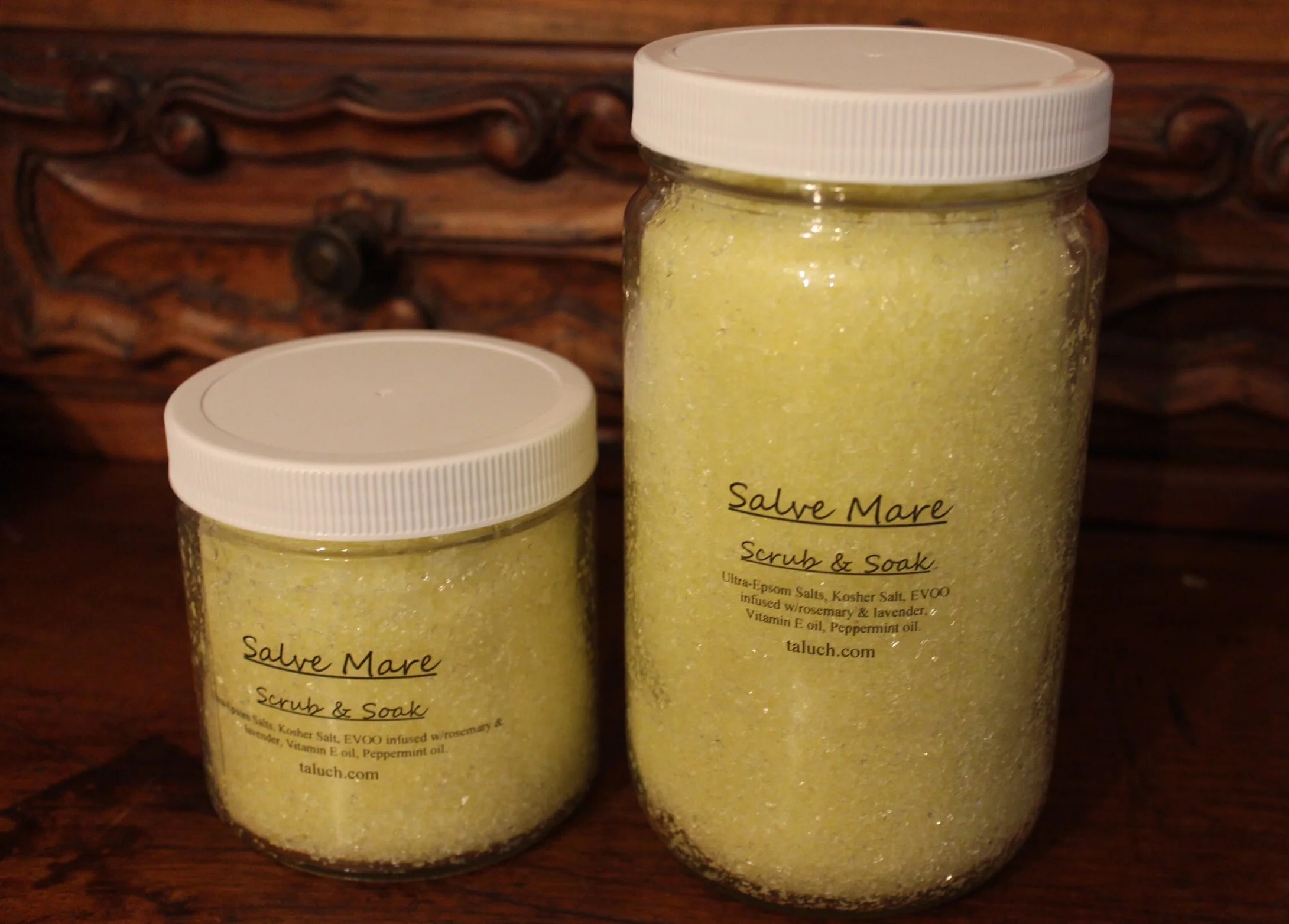 Salve Mare (sahl'veh mah'reh) developed from long winters and the need to invigorate and hydrate the skin. Anna Talucci created this body scrub with the two base ingredients being sea salt and extra virgin olive oil. The name is inspired from the Mediterranean Sea and the Ancient Roman Baths. This name Salve Mare translates from Italian to "Hello Sea".